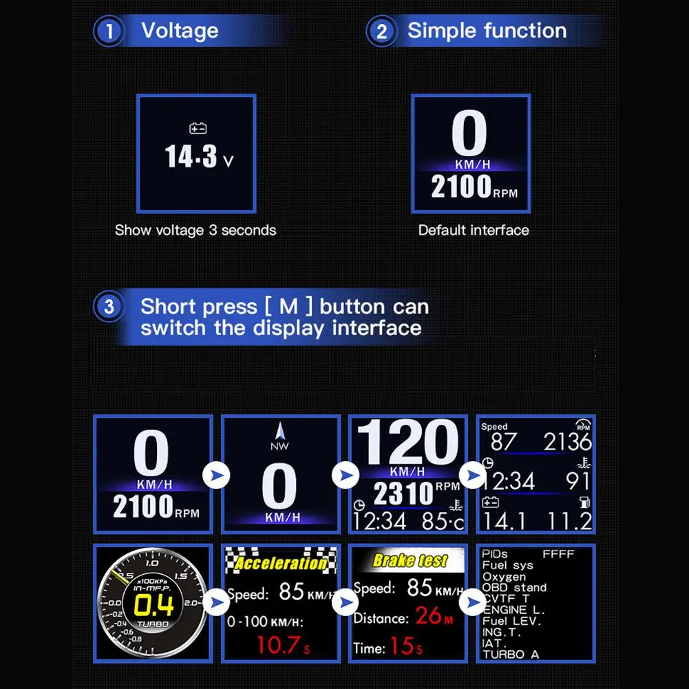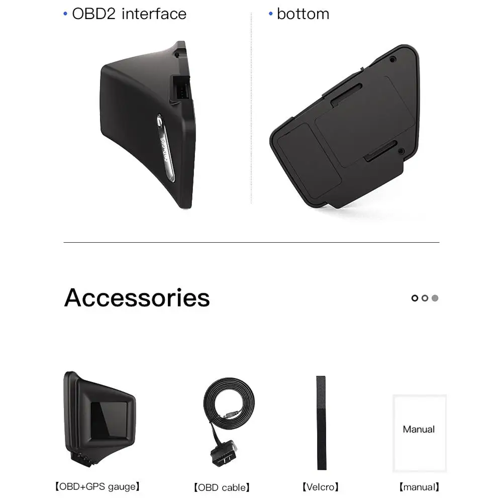 1. OBD+GPS dual system. 2. Two installation methods, A pillar installation + center console installation. The first stopwatch that can be installed on the A-pillar. 3. Currently, the first screen can rotate 270 degrees. 4. The first HUD small code table reaches the highest resolution of 240*240 for high-definition display. 5. There are three types of turbine pressure: PSI, 100KPA, bar. The turbine value can be adjusted and calibrated to increase the fuel consumption unit KM/L. 6. Up to 10 Hz refresh rate, there will be no stall delay phenomenon. 7. The GPS function can be displayed at the same time in the OBD mode, which is currently the first in the industry. When the speed is switched to MPH per mile, the water temperature will be automatically switched to Fahrenheit degrees, the single driving distance will also be automatically switched to Miles, and the fuel consumption will also be automatically switched to gallons MPG. 8 kinds of display screens can be switched. 9. Function: OBD2 mode: speed, rpm, water temperature, voltage, fuel consumption, clock, single travel distance, single travel time, oil temperature, turbine pressure, acceleration test, brake test, overspeed alarm, engine failure alarm, elimination of fault code, water temperature alarm , speed alarm, voltage alarm, mile switch, fatigue driving reminder, automatic and manual brightness adjustment. 10. GPS mode: speed per hour, altitude, number of satellites, clock, mileage of per trip, time of per trip, compass.